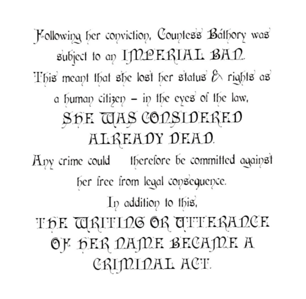 Báthory Erzsébet de Ecsed (in native Hungarian) was born a countess in 1560/61 to a violent & inbred noble family of wealthy landowners. The subject of rumour and speculation during her own life, the passage of time has only served to further obscure the truth about Báthory…