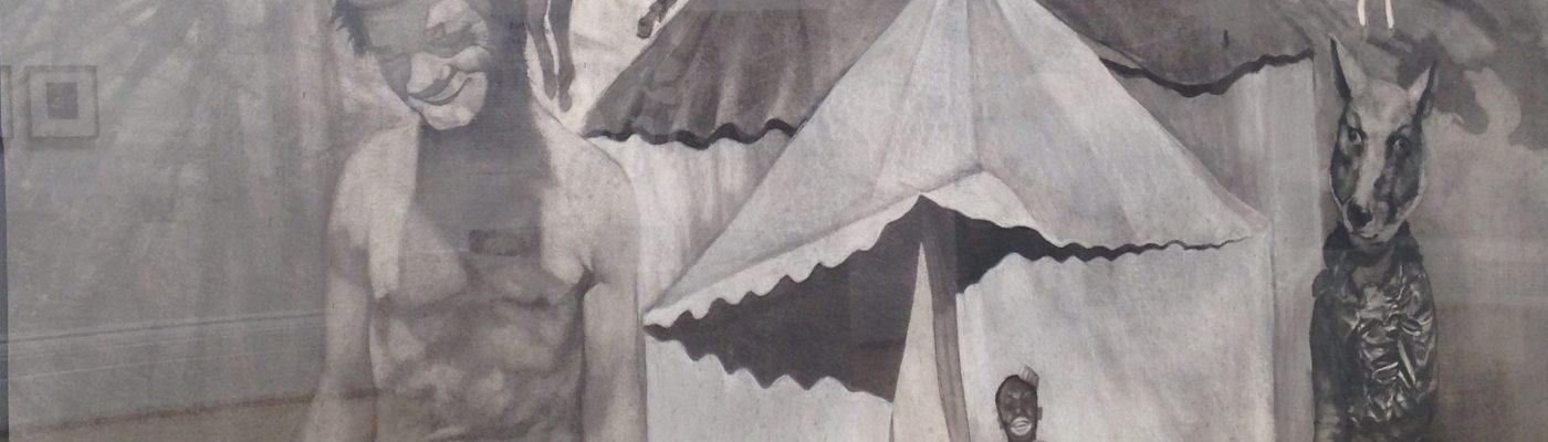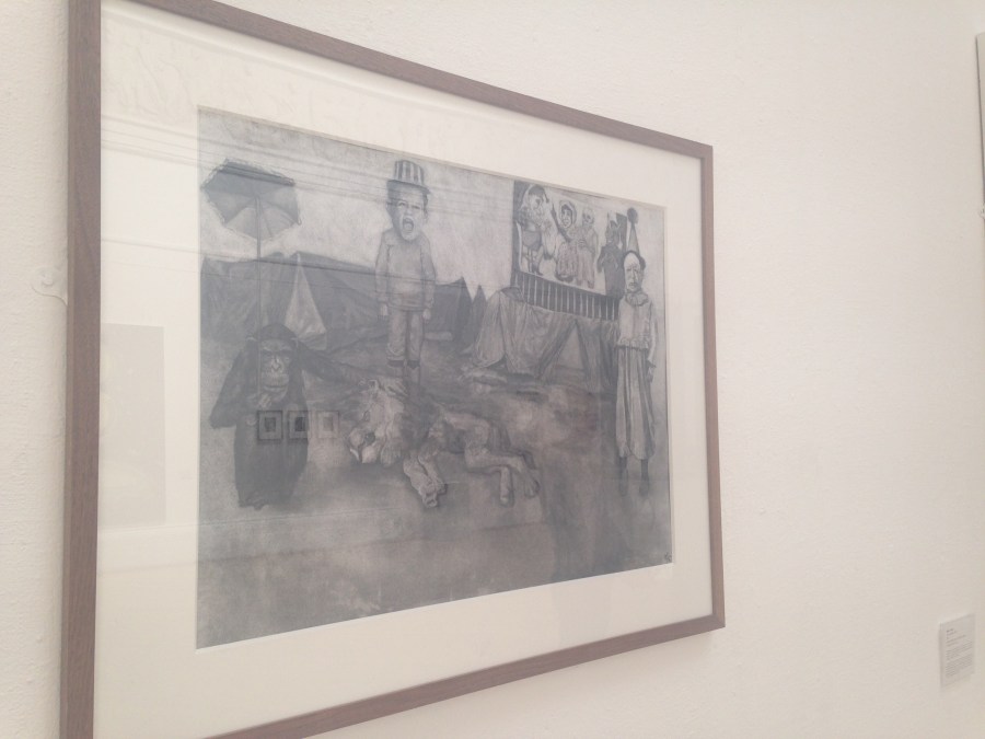 In ‘Death at the Circus’ (c.2006) Carter’s subject lies dead in the centre of the frame. Composed of charcoal, a number of familiar circus characters circle the lion, but the dark-haired chimpanzee captures the eye. This animal’s face is full of judgement, and its hand seems to simultaneously defend a fallen friend and accuse the audience. The intent of the image is to acknowledge the inhumane “past treatment of animals” (- RWA exhibition label) which was historically celebrated, as the exhibition is about to confirm.